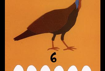 HAPPY THANKSGIVING! Hope you will have a fun and yummy Turkey Day!This turkey hen has six eggs.The illustration is from one of my first cut-paper art books Who Has More? Who Has Fewer? On the reverse side, the chicks have hatched!