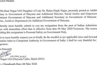 I want to inform all of you, Rani Nagar daughter Ratan Singh Nagar resident Ghaziabad, village Badlapur tehsil Dadri district Gautam Budh Nagar, I have decided to resign from the post of IAS. Right now there is curfew in Chandigarh, so I and my sister Reema Nagar cannot get out of Chandigarh. Roads from Chandigarh to Ghaziabad are also closed. After the lockdown opens, she will return to her native city Ghaziabad with sister Reema Nagar after resigning from her office and taking permission from the government as per rules.