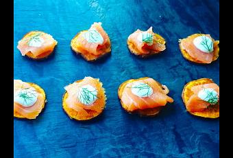 - Top each sweet potato slice with a slice of salmon, and a dollop of sour cream or crème fraiche.