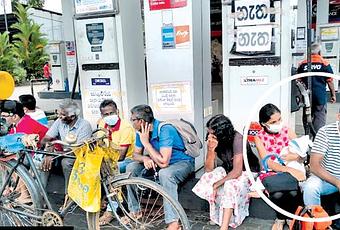A couple carrying their baby yesterday appealed to the military officers at the fuel station at Rambukkana in Bandaragama to provide them with petrol to take their child to the hospital. A security officer promised them fuel as a fuel bowser was on its way and assured them of a speedy passage to hospital. They are seen awaiting the bowser at the shed. Picture by Bimal Jayasinghe in Bandaragama.