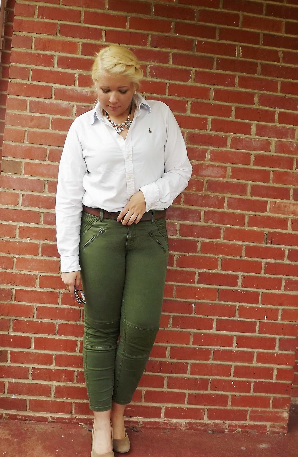Outfit: Oxford- Ralph Lauren, Pants- Gap, Belt- LL Bean, Wedges-Target, Necklace- Cato FashionsThere are some days when your hair just doesn't work right but settling for a top knot is out of the picture. I decided to do a braid wrapped into a low pony. I loved this look. It was almost business wear, almost. It might have been appropriate with different pants or a different skirt. I would wear this for a "casual" Friday if at all.