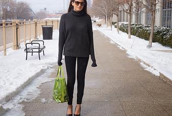 I love wearing neutral colors. I've used just about every trick in the book to avoid having a substantial amount of color in my wardrobe. This time I used the "pop of color" tactic to pull off the black on black look. During the summer this neon green bag is my go-to beach bag, however in the winter it doubles as my work bag with the appropriate outfit.