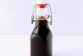 - Once the hojicha and sugar are fully dissolved, transfer the syrup into a sterile glass jar.