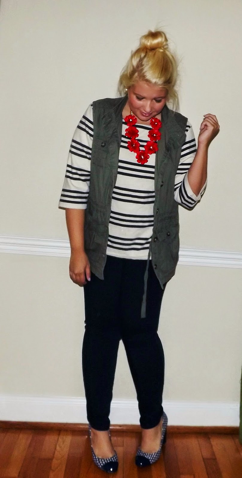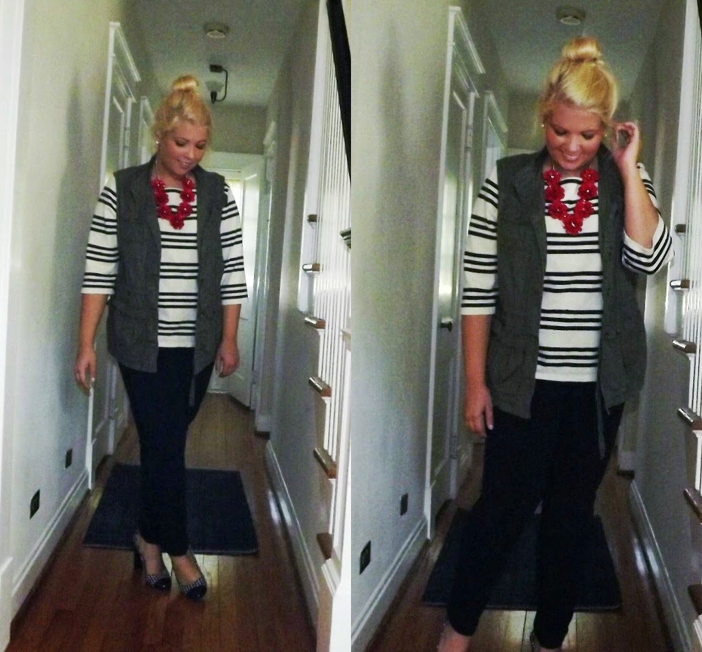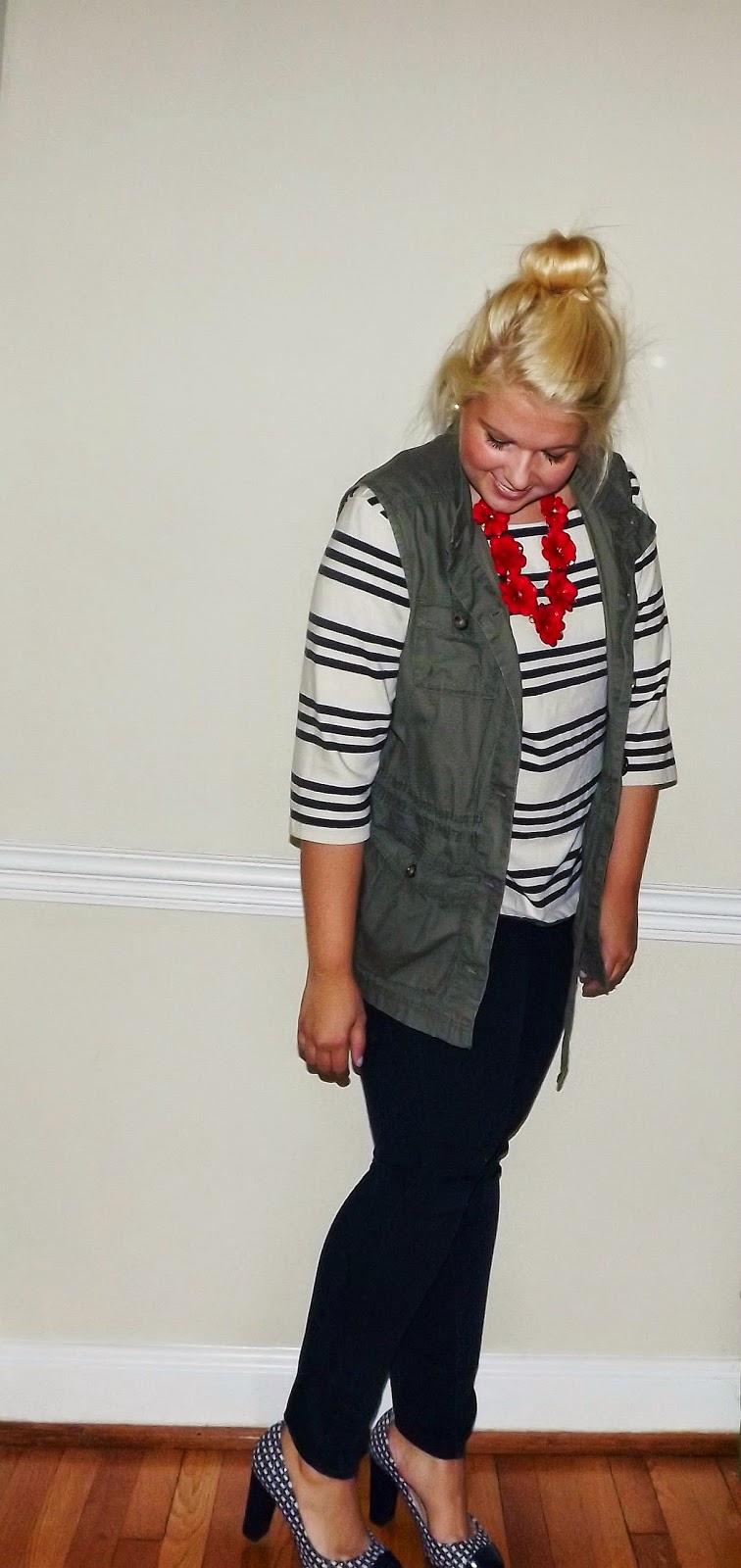 Outfit: Vest- Old Navy, Top- Old Navy, Jeans- Old Navy, Heels- J.Crew, Necklace- via EtsySometimes a girl just has to rock the messy bun to get through the day. One of my new obsessions is playing with prints. I love the idea of a completely off print that complements another simple one. In this case, I combined the stripe with the random tweed in the heels and loved it. It made the look more dressed up which would have been perfect to go to dinner or into a casual run through. I just wore it to run errands around campus.