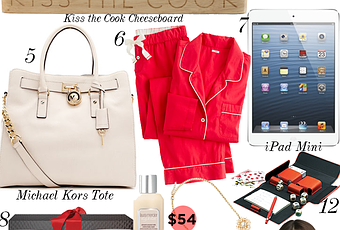 1. Mackenzie-Childs Gift Set $155 2. Lulu Frost for J.Crew Bracelet $128 3. La Mer Gift Set $285 4. C.Wonder Cheeseboard $38 5. Michael Kors Tote $298 6. J.Crew PJ Set $85 7. iPad Mini $329.99 8. Laura Mercier Gift Set $65 9. BaubleBar Necklace $54 10. Yosi Samra Flats $88 11. Diane von Furstenberg Scarf $220 12. Bridge Set $190 13. Tory Burch Cardigan $295 14. Diptyque Candle Trio $84
