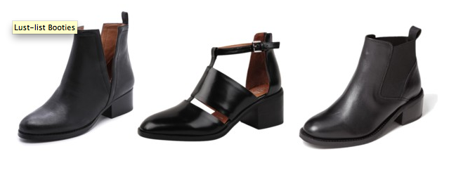 Last, but certainly not least; black ankle booties. I have been practically living in my pair from Jeffrey Campbell, which I have been featuring often on the blog. However, my shopping philosophy says that there comes a time when you need another pair. The first/second pair, also from Jeffrey Campbell, are a unique take on the cutout bootie, while the third is a classic, goes-with-anything, kind of pair.