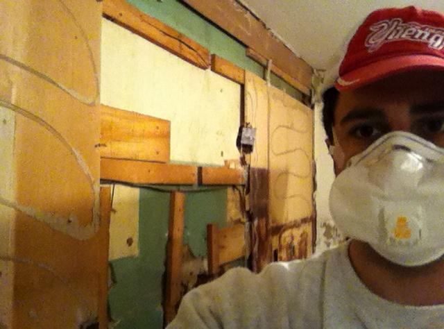 When I originally started work on the kitchen, I thought that I would only be putting in new cabinets and painting the walls. Nope! When we took down the original cabinets it was no easy task. They were all glued together! And glued to the wall! Everything was glued together and there were no studs behind the wall. So, after breaking the old cabinets down, ripping down the wall, putting studs up, sheet -rocking it (thanks to the help of my grand father), taping/spackling, and sanding, I’m at the point where I can finally prime the walls and get the cabinets installed.