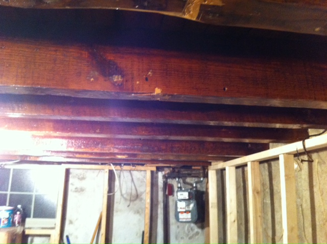 The Basement:The basement, the cellar, the Man-Cave to be, is another on going project. There originally was a ceiling. I took it down to make room for about two inches of head room. The joists are now exposed. My father took the liberty to make this his own project. After many nights of sanding and staining the joists, the basement ceiling is now finished. This is not the best picture, but it looks awesome.