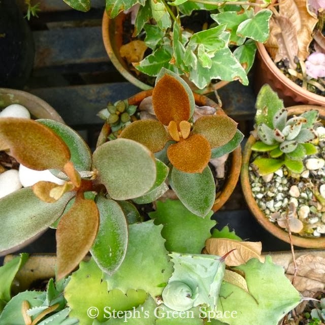 Here are some of my kalanchoes. On the left in the pic below is the Kalanchoe orgyalis. Love the colour! Next to it (on the right) is Kalanchoe tomentosa. I really like its hairy texture ;-)