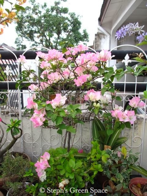 Though the plants in the garden have to thrive harder for their leaves and flowers to flourish, some are doing ok. Here are some of my favourites...Last week, many blooms emerged from my bougainvillea. They seems more pink than usual, making the shrub looks so bright and cheerful. However I would have loved it more if the shape of the top was rounder. Also I think a cat has climbed on it earlier. A branch seems to be bending down to the pot below and the bougainvillea looks a bit distorted...