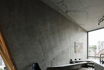 A rough-cast concrete cantilevering spiral staircase connects the rooms on different levels. The glazed slits between the stepped floors also provide visual interaction between the rooms.
