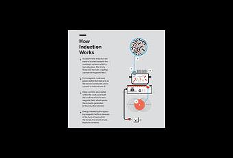1) A coiled metal induction element is located beneath the cooktop's surface, which is typically glass. Electricity flows into the coils, creating a powerful magnetic field.