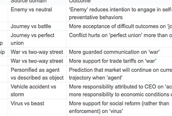 Metaphors can covertly influence how people think. That is, people are not always aware that they have been influenced by a metaphor.Two figures (click to enlarge):