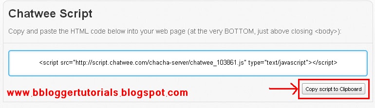 3- After creating your chatwee account, login to your account with your username and password, then you will see a code, just click on “Copy script to clipboard”.