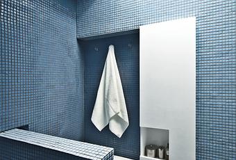 In this uber-efficient Brooklyn apartment, the resident kept lines as pure as possible by designing built-in storage alcoves. The cutout space in the white bathroom cabinet does double duty as a door pull and a cubby for frequently used items. Photo by Gile Ashford.