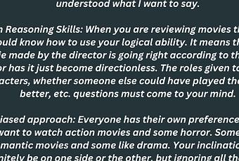 - High Reasoning Skills: When you are reviewing movies then you should know how to use your logical ability. It means that the movie made by the director is going right according to the script, or has it just become directionless. The roles given to the characters, whether someone else could have played those roles better, etc. questions must come to your mind.