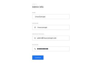 After filling the admin user’s information, the next screen will ask you the information to configure the Organization: