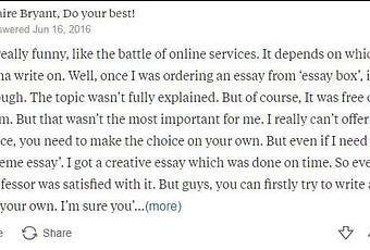 Once you get a URL from Google for an Essay writing service company, you can go to Quora, enter the URL along with the keyword “review” (e.g- Company name + Review) and see what other users are saying about it.