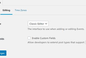 The Editing settings page is where you make two important choices. The first choice regards which event editor to use – either the new block-based one or Classic mode (which is the default). Enabling custom fields means that your developer can extend content on this same principle for storing any additional information about each individual occasion.