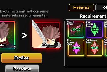 The evolution process transforms your base unit into Sukuna, unlocking his powerful abilities and enhanced stats.