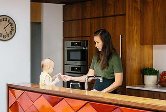 In the kitchen of a classic midcentury home in Portland, Oregon, the original red tiles survived a renovation and continue to add color and visual interest against a sea of wood paneling.