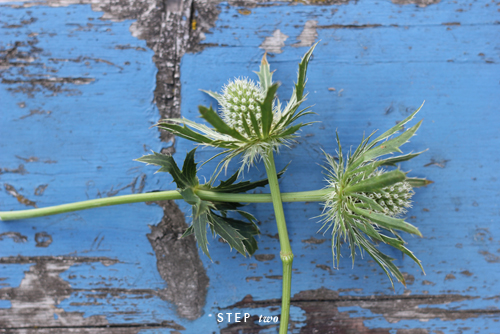 Step 5: While holding the two stems in place with your left hand, place another stem on top and bend it under.
