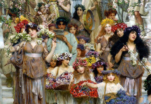 GUYS, look at these! Seriously, this was one of the funnest projects/shoots I've done yet! The model, Cecilie, the photographer, Amanda, the flowers! I die. Ok, ok, we've seen floral crowns everywhere these days but I just had to try my hand at it. It all started last year when I spotted this painting by Lawrence Alma-Tadema at the Getty. Now, floral crowns are nothing new to the art historical oeuvre, but for some reason this one really struck me. Take a look at the full painting (it's 179 x 80cm) and now imagine what a scene this could have been IRL. It depicts the Cerealia festival on the Roman streets. I mean, everyone is carrying branches and flowers and wearing them on their heads and playing instruments? This is my kind of town! Nuts!