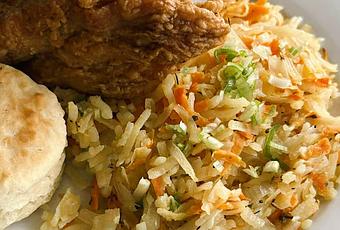 This is a very versatile side dish and works very well on the sides of all types of protein. Chicken, pork, lamb, beef, fish. All would go well with this. On this day I served it with some leftover fried chicken.