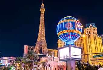 Though you can’t enjoy the slot machines inside the luxurious Paris Casino, you can ride to the top of the building’s attached Mock Eiffel Tower. Once at the top, you’ll get an impressive light show every half hour.