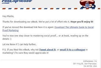In this specimen, AdEspresso customised the greeting mail for its new subscribers. The company also divided its new subscribers depending on which offer attracted them to the brand in the first place. This would allow the company’s marketing team to send more targeted offers in the future.