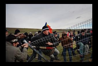 Romanian protesters tear down the fence of the exploring perimeter of US energy giant Chevron in Pungesti, Romania on December 7, 2013. (AFP Photo / Daniel Mihailescu)