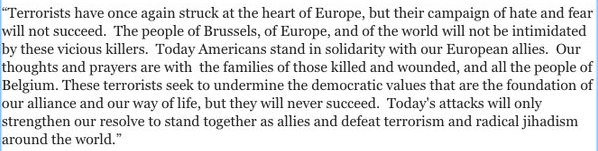 “We offer our deepest condolences to the families who lost loved ones in this barbaric attack and to the people of Brussels who were the target of another cowardly attempt to terrorize innocent civilians. We stand with our European allies to offer any necessary assistance in these difficult times. Today’s attack is a brutal reminder that the international community must come together to destroy ISIS. This type of barbarism cannot be allowed to continue.”