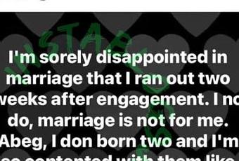 "I am sorely dissatisfied in marriage that I ran out two weeks after engagement. I no do, marriage isn't for me. Abeg, I don born two and I am so contented with them like this.: