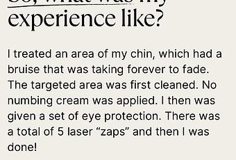 So how was my session? Short! A little bit painful. Lovely results! The whole appointment lasted less than 10 minutes. We disinfected the treatment area, no numbing cream was needed. I was instructed to wear eye protection to reduce harm from the laser beam. It was a series of five quick zaps, and then it was over. My Dermatologist told me that it would feel like a hairband snapping against my skin, and she was right. It wasn't pleasant, but it wasn't too uncomfortable either. Then we applied sunscreen and I was out the door! To see my before and afters (taken less than 24 hours apart) head on over to my new Instagram account.