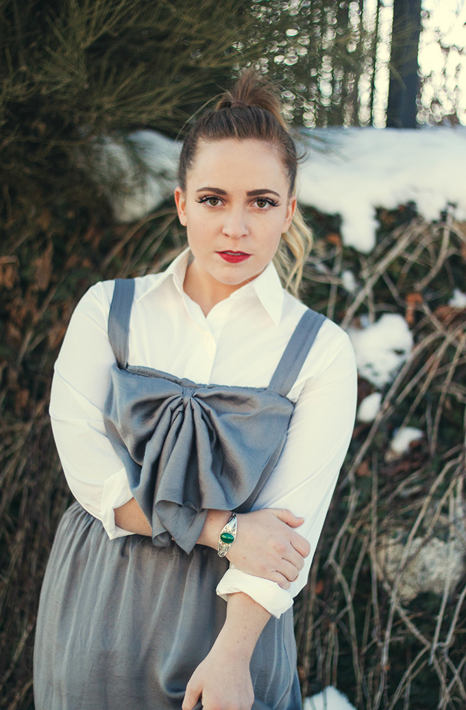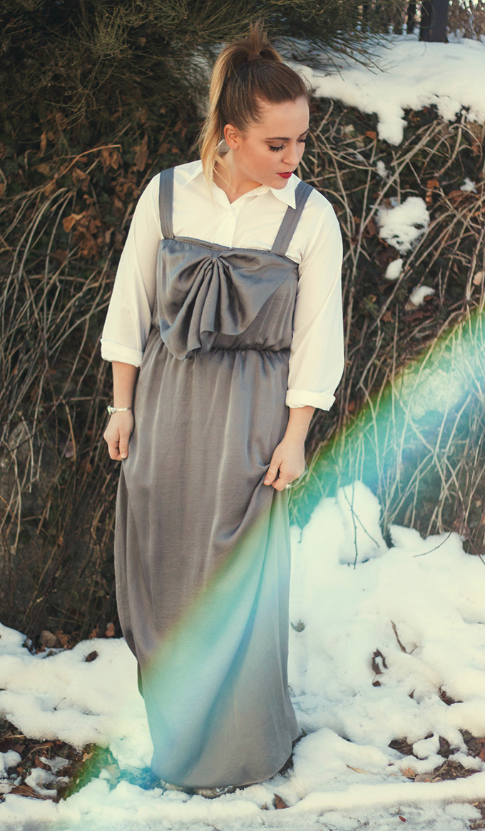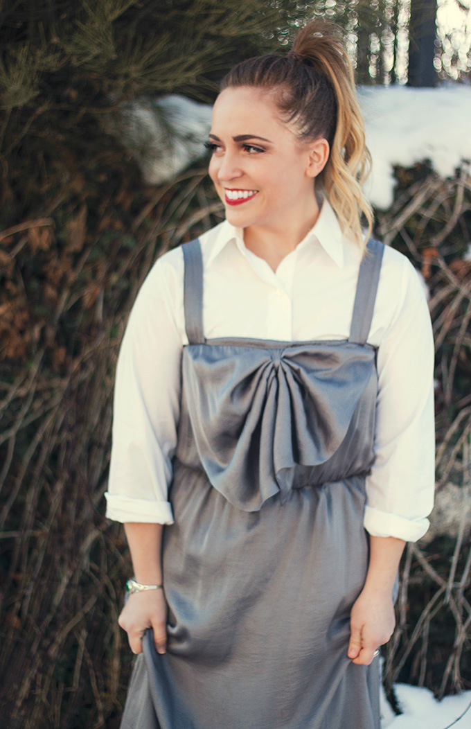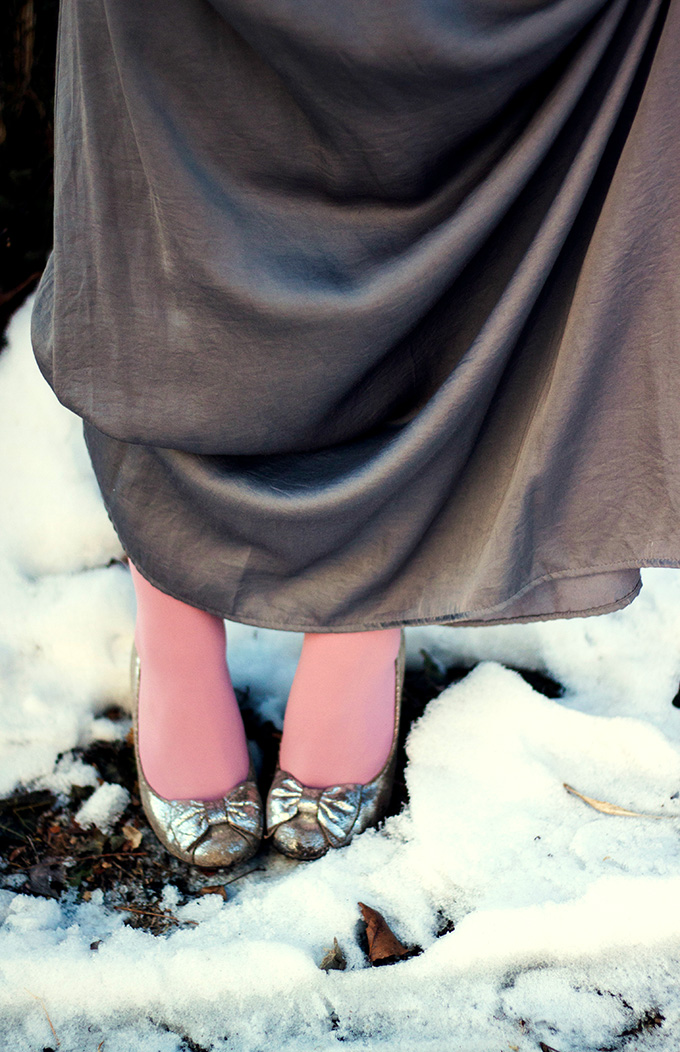 This dress is one of my favorites, and it happened to match the scenery. Silver and slick- just like the ice. I decided to add a bit of color to my outfit with a pop of pink in my tights.