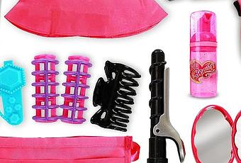 -- This hair stylist toy for 18-inch dolls includes- Real Working Hairdryer, Curling Iron, Apron, Cape, Haircutting Scissors, Spray Bottle, Brush, Mirror, 2 Rollers, and 3 Hair Clips