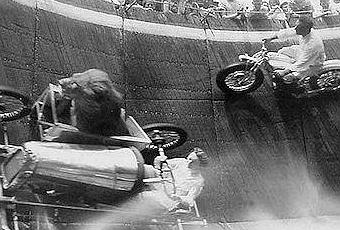 Derived directly from United States motorcycle boardtrack racing in the early 1900s, in 1915 the first 'silodromes' with vertical walls appeared. Sometimes the riders drove alone, sometimes they had another performer as a passenger and sometimes the passenger was a lion.
