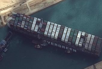 Ever Given container ship is pictured in Suez Canal in this Maxar Technologies satellite image taken on March 26, 2021. Maxar Technologies/Handout via REUTERS ATTENTION EDITORS - THIS IMAGE HAS BEEN SUPPLIED BY A THIRD PARTY. MANDATORY CREDIT. NO RESALES. NO ARCHIVES. DO NOT OBSCURE LOGO. (VIA REUTERS)