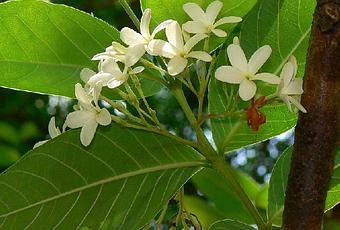 The Kutaja is basiucally a large shrub or a glabrous medium sized tree. This tree is covered with dark-brownish and greenish color bark. This tree has dark green leaves which are oval in shape, simple, opposite and about 10 cm long. The plant has white coloured flowers which are about 2-3 cm long, and they are less fragrant. The fruits of this plant are paired and cylindrical in shape. The seeds of this plant contains numerous light brown color, and these are covered with silky hairs.