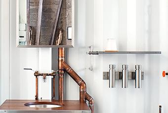 Though we love the custom teak-and-steel sink, shelving, shower caddy, mirror, shower, and vanity by Pat Carson Studio, the real coup of this bathroom is that the window at left goes from transparent to opaque with the touch of a button. The Duo Poliert dispensers beneath the shelf are from Blomus. A toilet opposite the sink is from Toto.