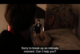 In various scenes of the Amazon Prime series other characters assume that Aziraphale and Crowley are a couple. In the second episode the two of them are investigating in an old convent/hospital what happened to the lost antichrist, where Crowley is pinning Aziraphale against a wall after the angel accidentally insulted him. Sister Agnes eventually interrupts the two of them by saying "Sorry to break up an intimate moment", thinking that the two of them are in fact having an intimate moment.
