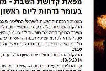 The Rabbanut, in its most recent newsletter update, has announced that because Lag BaOmer falls out on Motzei Shabbos, the official lighting of the bonfires will be delayed until Sunday evening, to avoid causing chilul shabbos (of people who might light too early, along with security forces who must prepare for the various events).