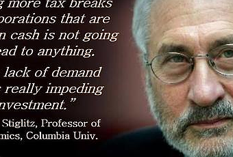 Now an economics professor from Columbia University, Joseph Stiglitz, has taken up the cause. He knows that neither lower taxes for the rich nor higher profits for corporations will solve our economic problems. The rich have more than ever before, and the corporations are making record profits (and sitting on a record amount of cash, and that has not cured the economy. Giving them even more will fatten their bank accounts, but it will do nothing for the economy.
