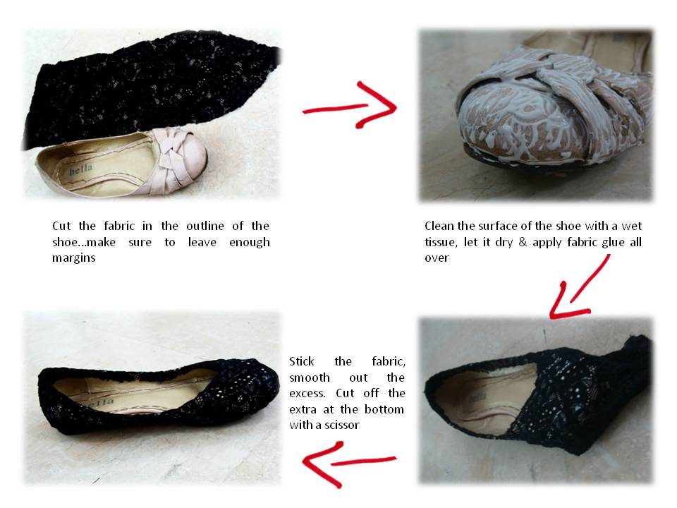 So this is how the pair looked before I got started - pretty pathetic I know...even now I think its an awful waste for a good shoe!So to make them re-usable, I had to change the color obviously. If you have something similar, you can chose the fabric color as per your liking but it always is better to match or keep the fabric color close to the color of the sole...in my case it was black so I chose to use a black lacy cloth (salvaged from an old shrug - also something I was planning to throw away!).What you will need is a pair of scissors, some fabric glue and some thread in the some color as the fabric and a big sowing needle. The rest of the steps are below..