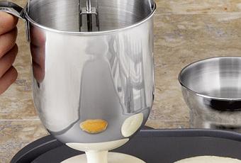 It’s the weekend, mornings with the family is great. Let’s make some pancakes… Maple syrup anyone? I saw this no no-drip pancake dispenser portions uniform amounts of pancake batter onto a griddle with the ease of one-touch, one-handed operation. Releases delicate crepe batter onto a skillet, thick waffle batter or fills muffin cups.
