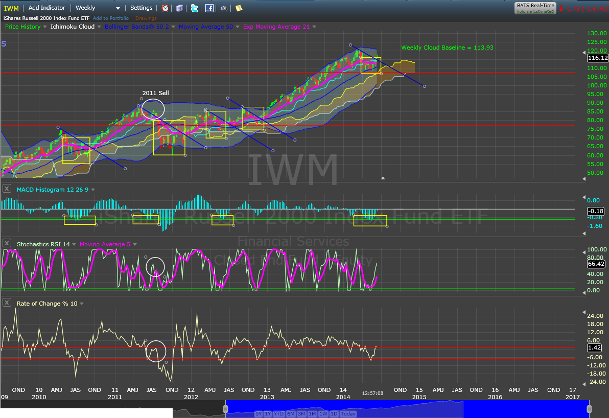 As you can see from the chart above we have peaked above the blue line. This is the import of that move. We have the 2011 setup, and the indicators match. For the bearish scenario, we want to see IWM follow that 2011 fractal and break back down this week or next week below its Weekly cloud baseline at 113.93. If IWM instead holds that baseline, we know we are in a bullish move and the stop is right here below us (from a weekly perspective).