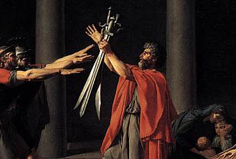 At the urging of their father, stoic sons swear an oath on their swords to defend their city at the cost of their own lives. David is beginning to depict political desires leading to the French Revolution and reaches back into classical history for a theme to represent a new ideal of politics; in this case, a scene from a Roman legend where sons from one of two warring cities agree to end the dispute by fighting the other.