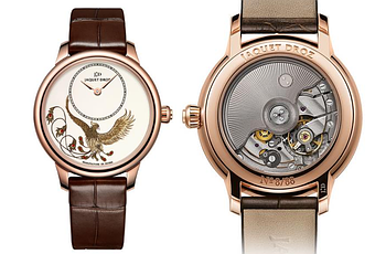 The painting on enamel technique is done by hand with the help of a microscope and takes on average one week to complete one watch. This watch features a golden phoenix with red highlights on its feathers, symbolising re-birth and myth.