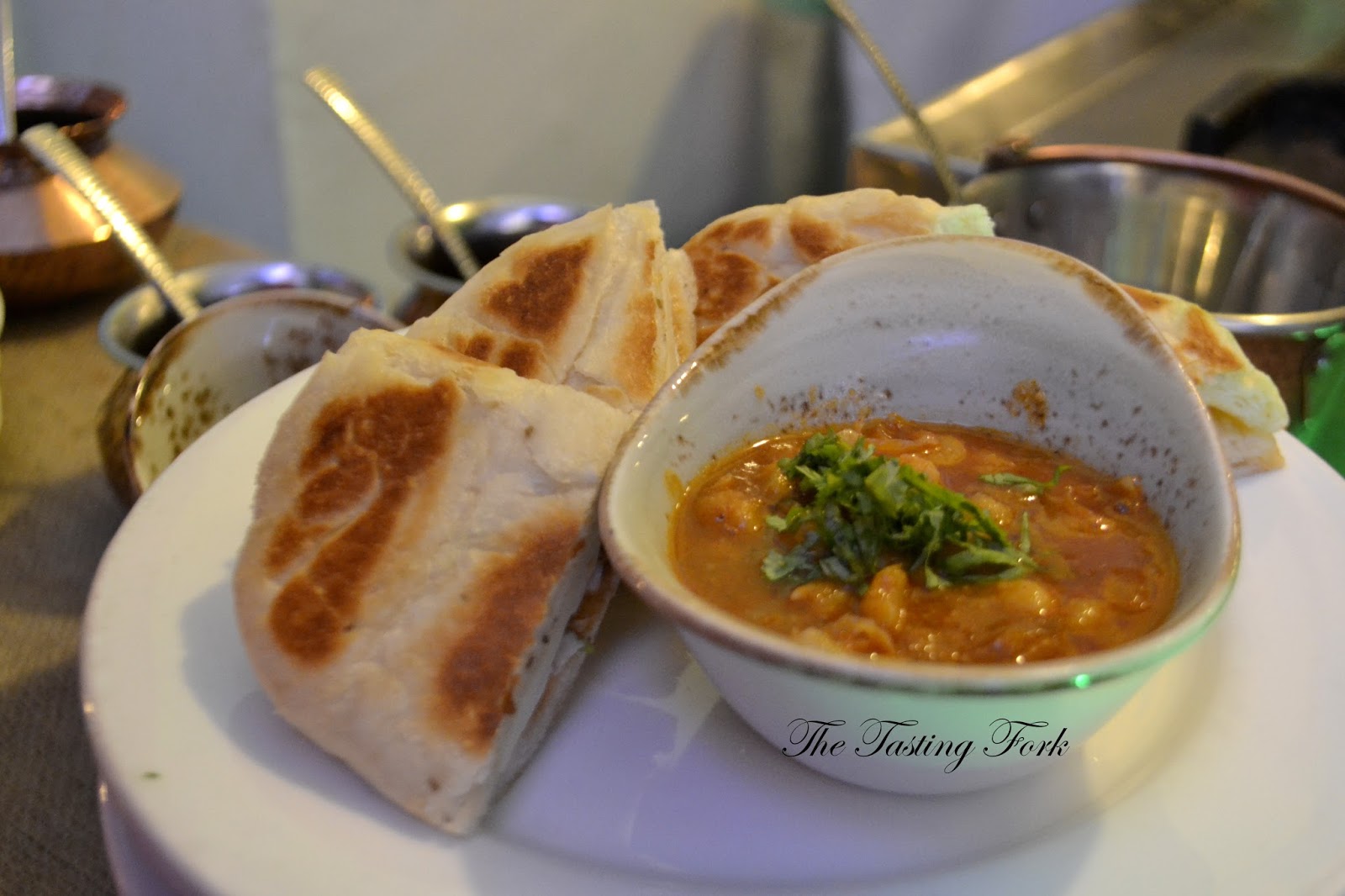 The Kashmir live counter had Kulcha Kalahrhi. Kalahrhi is a kind of cheese that's only available in Kashmir and has to be provured from there. That is what makes the kulcha so special. The kulcha is put on a pan to make it slightly golden, is stuffed with tomatoes, onions and coriander, layered with kalahrhi cheese and served with some kickass chhole.