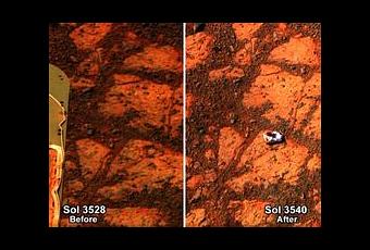 He said the images, from 12 Martian days apart, were from no more than a couple of weeks ago. “We saw this rock just sitting here. It looks white around the edge in the middle and there’s a low spot in the center that’s dark red – it looks like a jelly doughnut.